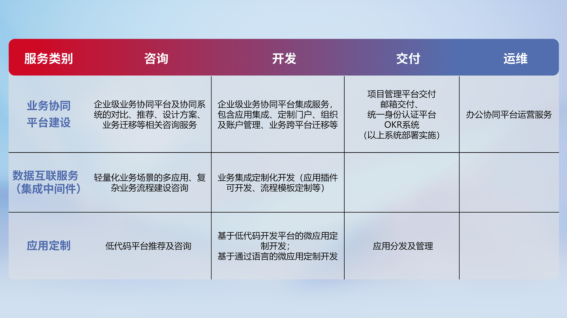 针对钉钉、、、企微、、、、IDaas等平台级产品提供产品的规划、、方案、、交付、、定制化开发等服务,,实现如统一协同办公、、智能客户服务、、、、混合会议管理、、、、智能数据查询、、、、等业务场景,,实现数字化转型。。。。